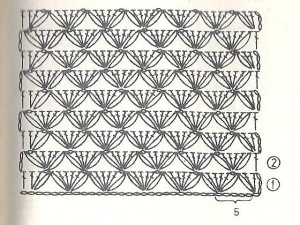 Rangs 2 à 13: identiques au rang 1, avec * 1br, 1ml, 1br* dans la ml du rang précédent ( celle des 11è, 21è, 41è et 51è mailles de la chainette de départ).