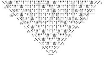 rang 6 : 3 ml, 1 b sur la 2ème b du rang dessous, 1 ml, 3 b et 1 ml les 2 premiers arceaux de 1 ml, 1 b sur la 3ème b du groupe de 3 b suivant, 1ml, 1 b sur la 1ère b du groupe de 3 b suivant, puis 3b et 1 ml dans chaque  arceau de 1 ml qui se présente, puis 1 b sur chacune des 2 brides qui se trouvent en fin de rang.