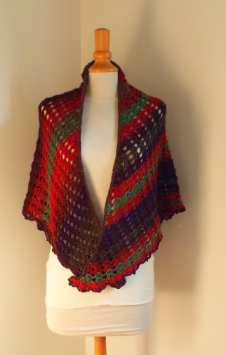 Un joli châle qui se crochète en travers (ce qui donne des rayures en biais avec une laine dégradée!),