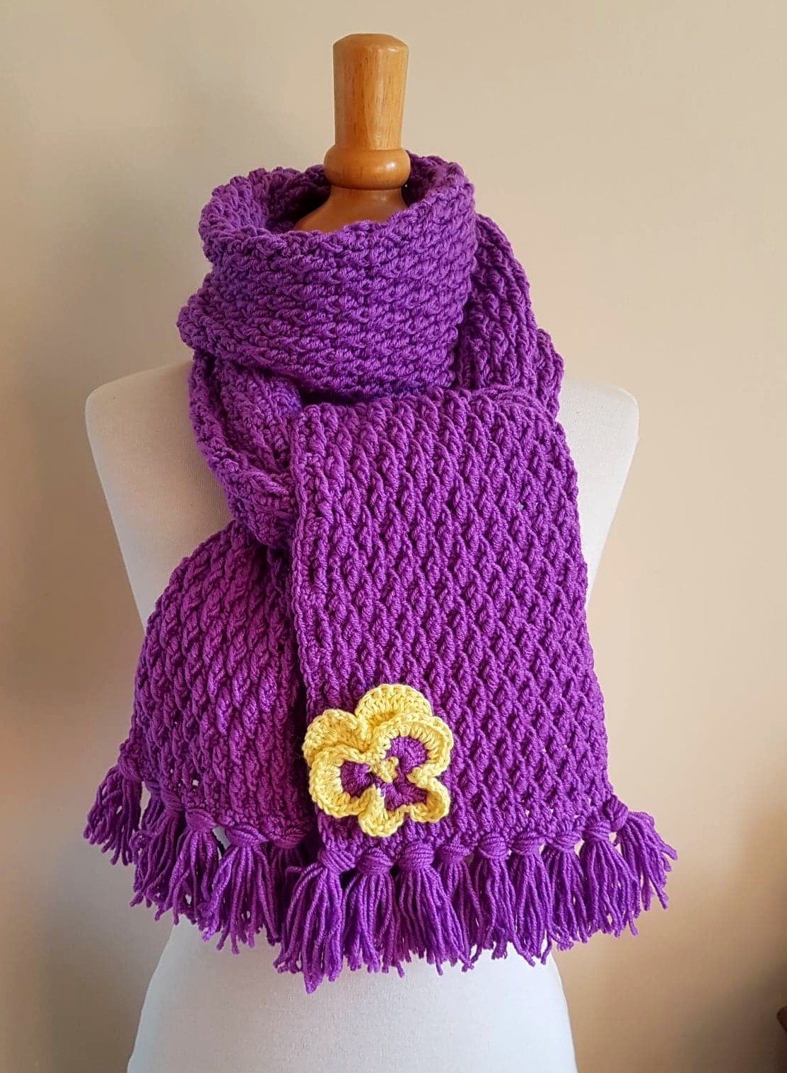 Mon écharpe mesure 19cm de large (24 mailles en l’air au départ, crochet 4.5 pour moi)