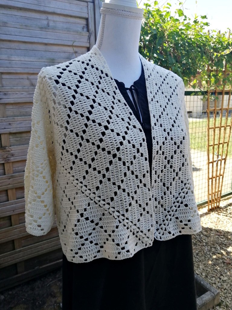 Il s’agit d’un petit gilet Shrug qui se crochète en deux parties seulement,